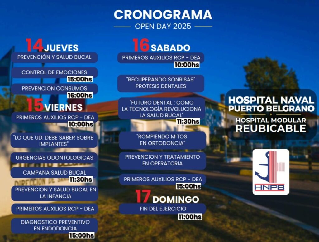 El Comando de Adiestramiento y Alistamiento de la Armada invita a la comunidad a participar de las Jornadas de Salud y Protección Civil que se llevarán a cabo en el Parque Centenario de la Base Naval de Puerto Belgrano, el día jueves 14 de 15:00 a 18:00hs, viernes 15 y sábado 16 de 09:00 a 18:00hs y el domingo 17 de 09:00 a 11:00hs.