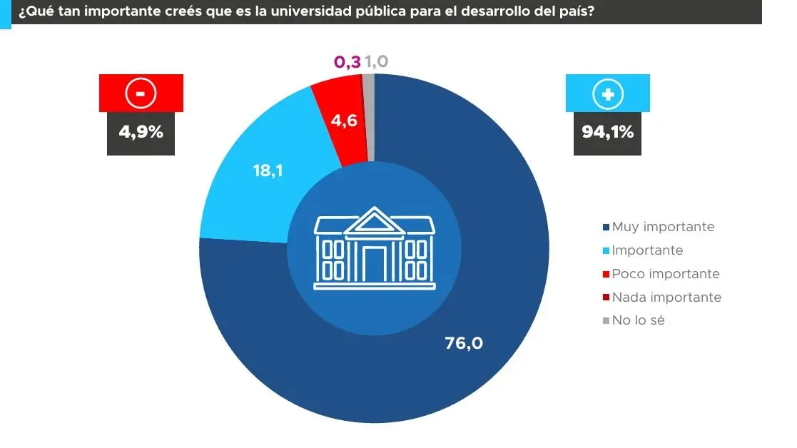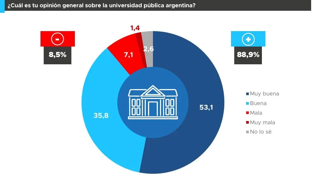 La poda al presupuesto universitario ya fue motivo de dos marchas multitudinarias -de las más grandes de los últimos tiempos- en 2024 y promete asegurar otra gran movilización este miércoles frente al Congreso cuando Diputados trate el rechazo al veto de Javier Milei a la ley de Financiamiento. Por más que el Gobierno intente demonizar a la universidad pública con cuentos de ñoquis y demás, la institución mantiene una imagen positiva del 89% y un casi absoluto 94% la considera fundamental para el desarrollo del país. En base a eso, un 71,2% consideró que el veto perjudicaba la imagen de Milei.