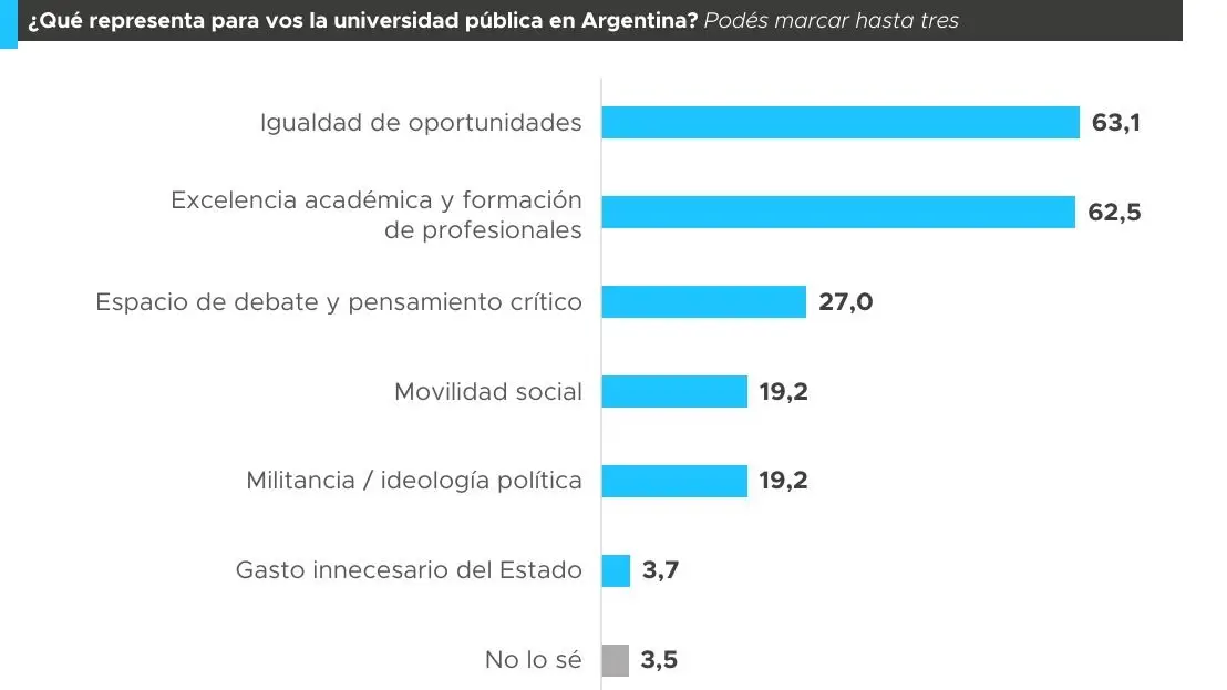 Bastante más abajo en la lista aparecen algunos de los conceptos con los que machacan desde la Casa Rosada y reproducen sus medios amigos y los trolls libertarios en las redes sociales. Por ejemplo, que la universidad pública está signada por la militancia y la ideología política (19,2%), entendiendo que quien lo dice le da una connotación negativa. Un mínimo 3,7% consideró también que se trataba de “un gasto innecesario del Estado”. En la previa de la sesión clave en Diputados, Milei volvió sobre la mentira de que “algunas universidades no quieren ser auditadas”. “Durante la campaña del 2023 se la pasaron diciendo que iba a cerrar las universidades. Y no solo no se cerraron, sino que además tenemos las cuentas al día y algunas universidades no quieren ser auditadas”, dijo al hablar en un foro de emprendedores en Paraguay.