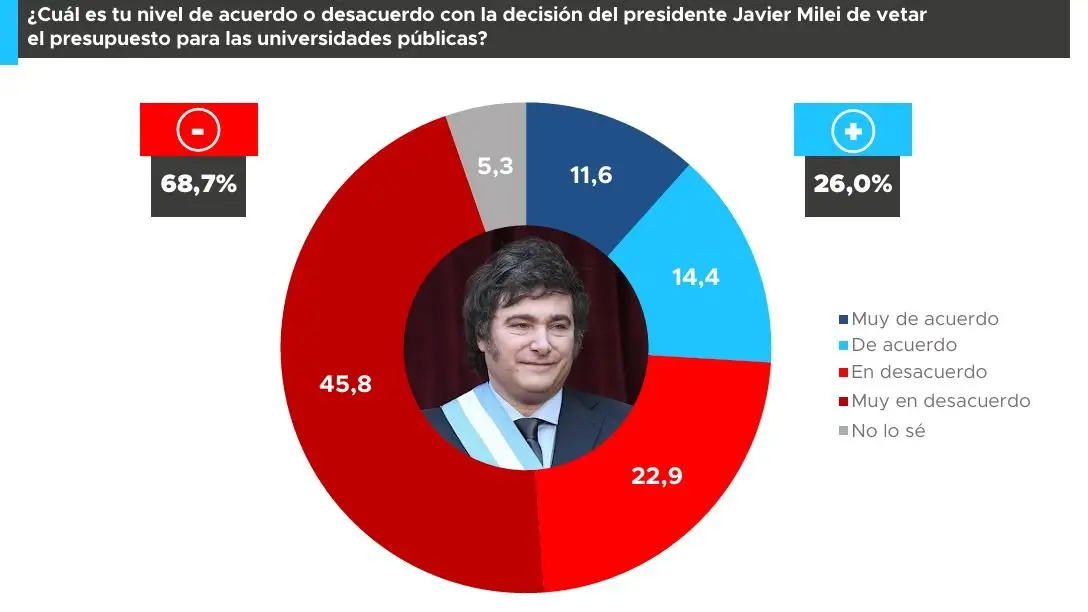 De acuerdo al trabajo de Proyección, apenas un 26% se mostró de acuerdo con el veto de Milei a la ley de Financiamiento Universitario aprobada en el Congreso por amplias mayorías. En cambio, un 45,8% dijo estar “muy en desacuerdo” y otro 22,9% “en desacuerdo” con la medida, un total de 68,7% de rechazo al veto. Incluso, hubo unos puntos más -71,2%- quienes opinaron que la decisión afectará la imagen de Milei. Menos del 20%, es decir que menos aún que su núcleo duro, interpretó que la medida no lo va a afectar.