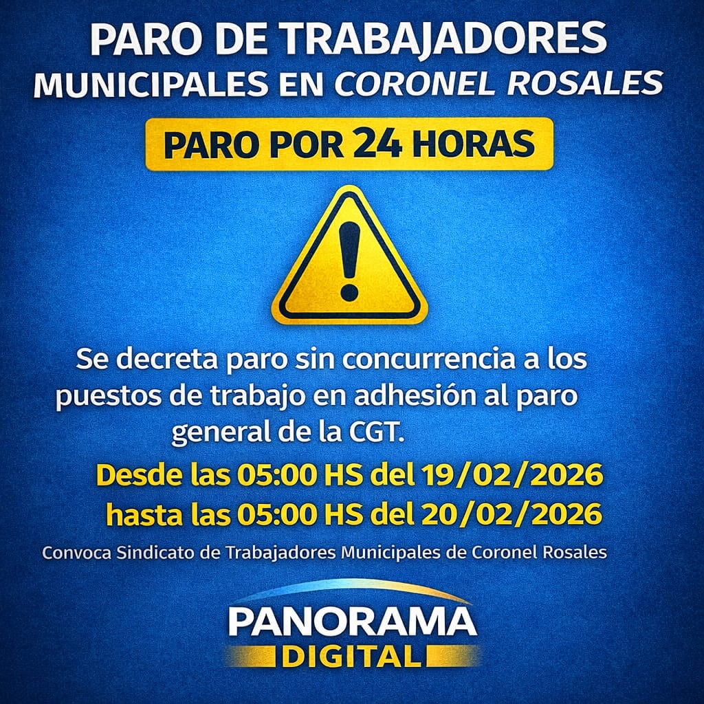 El Sindicato de Trabajadores Municipales de Coronel Rosales anunció una medida de fuerza por 24 horas, que consistirá en un paro sin concurrencia a los lugares de trabajo, en adhesión al paro general convocado por la CGT.